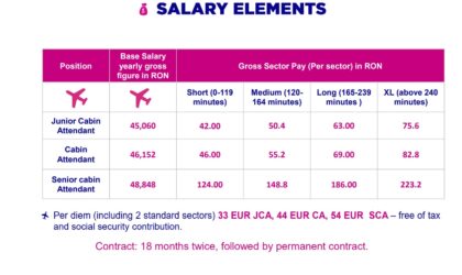 La acest salariu de bază se adaugă o indemnizație pe segment de zbor în funcție de lungimea zborului. Spre exemplu, dacă zbori 30 de sectoare medii pe lună, asta înseamnă unu plus de 1.500 de lei. Iar salariul depăsește 1.000 de euro.