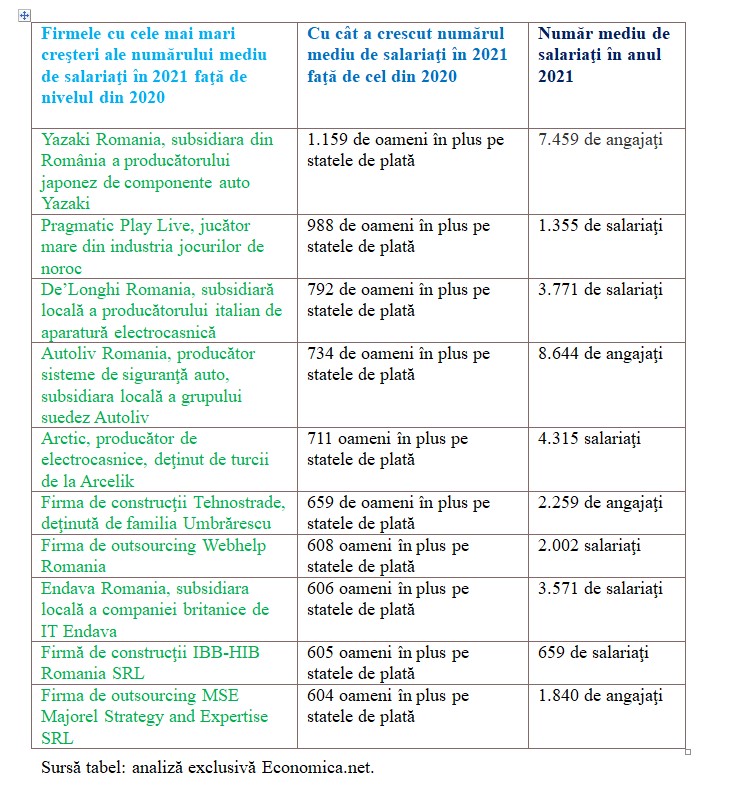 Printre companiile care şi-au sporit numărul mediu de salariaţi cu peste 500 de oameni în cursul anului 2021 faţă de cel din anul 2020 se numără şi: