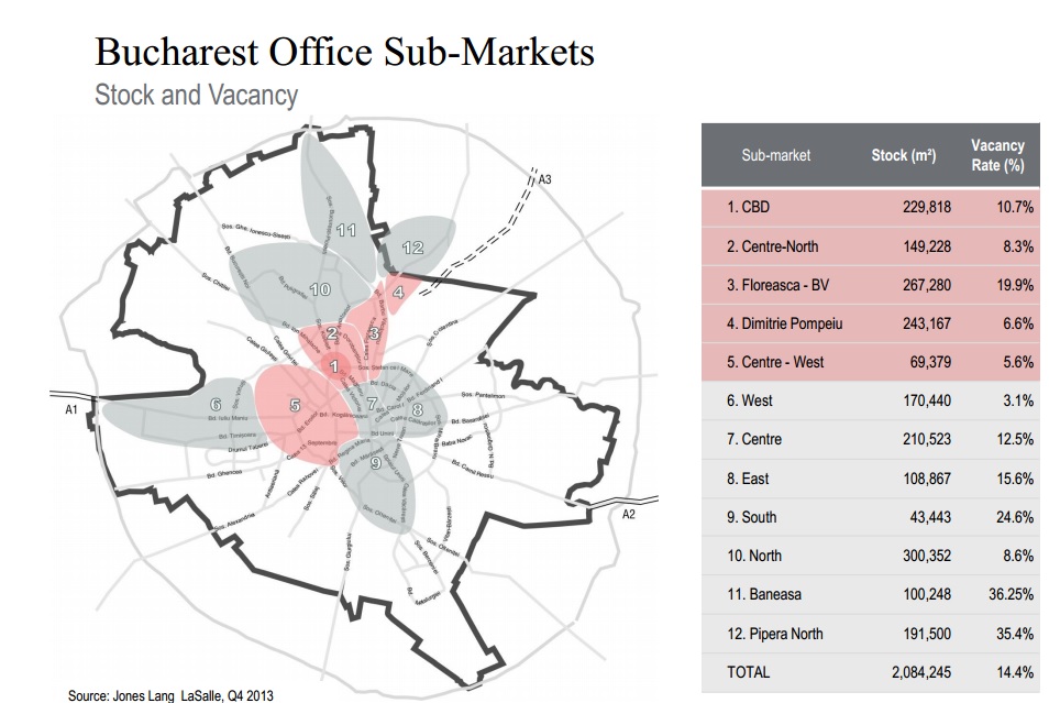 La nivelul Bucureştiului, rata medie de neocupare este de 14,4%. Chiriile au rămas neschimbate în trimestrul patru al lui 2013, de 18,5 euro/mp/lună, iar stimulentele financiare au continuat să fie consistente, proprietarii oferind luni libere de plată a chiriei, dar şi contribuţii pentru amenajarea spaţiului. Stocul de noi spaţii preconizat a fi livrat anul acesta este de 120.000 – 140.000 de mp, iar datorită volumului mare, anumite proiecte pot amâna deschiderea pentru 2015.